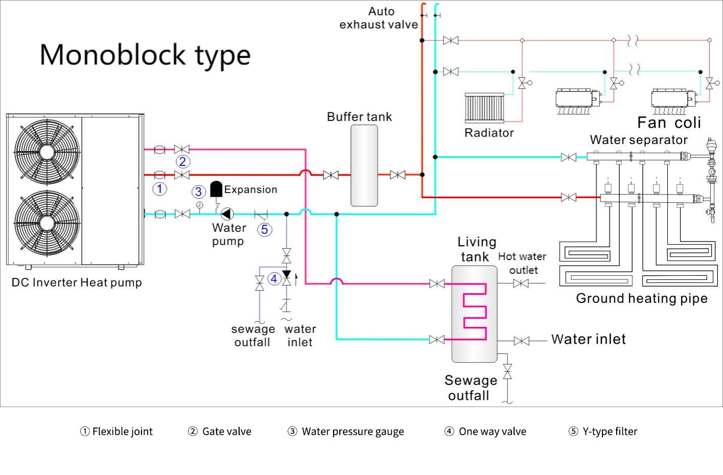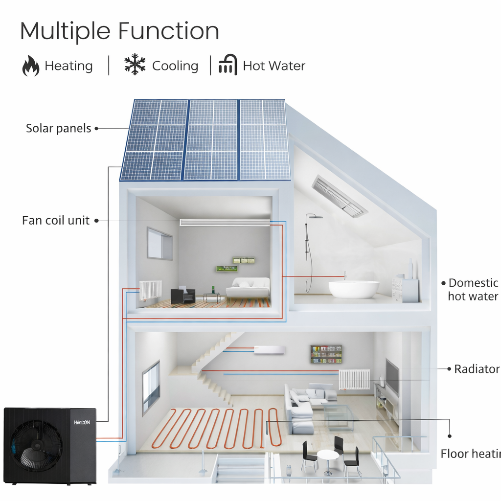 - Sukurtas šildymui, bet gali būti naudojamas ir patalpų vėsinimui per vėsinamas grindis, lubas ar ventiliatorinių konvektorių (fancoil) pagalba.