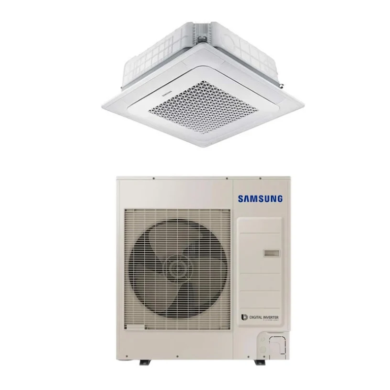 SAMSUNG BEVĖJĖS 4-KRYPTĖS 10.0/11.2KW KASETĖS (HEE) KOMPLEKTAS (VIENFAZIS ĮRENGINYS); KOMPLEKTUOJAMAS SU APDAILA IR DISTANCINIU PULTELIU.