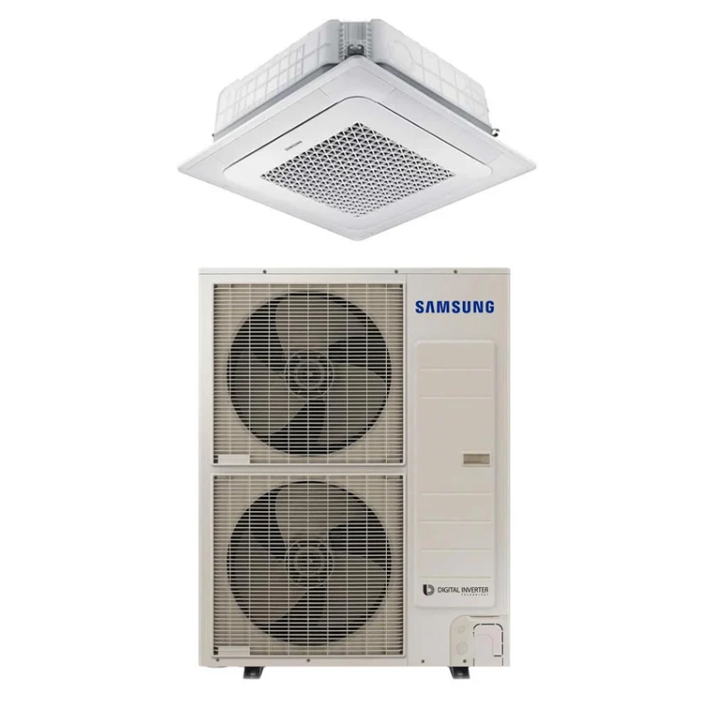 SAMSUNG BEVĖJĖS 4-KRYPTĖS 13.4/15.5KW KASETĖS (HEE) KOMPLEKTAS (TRIFAZIS ĮRENGINYS); KOMPLEKTUOJAMAS SU APDAILA IR DISTANCINIU PULTELIU.