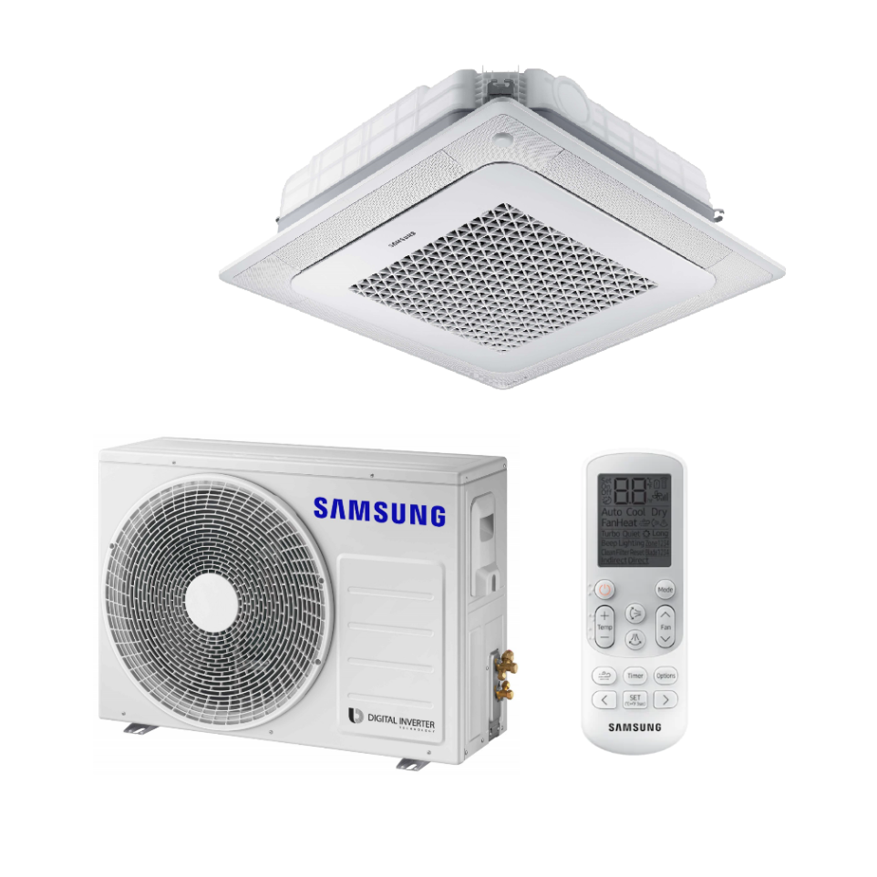 SAMSUNG BEVĖJĖS 4-KRYPTĖS 7.1/8.0KW KASETĖS KOMPLEKTAS; KOMPLEKTUOJAMAS SU APDAILA IR DISTANCINIU PULTELIU.